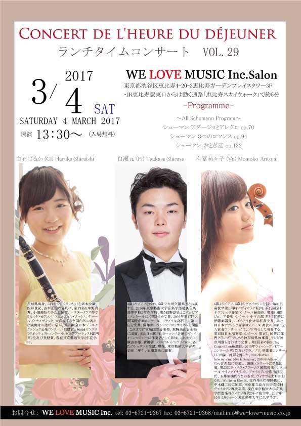 明日3/4(土)13:30~ 恵比寿ガーデンプレイス ガーデンプレイスタワー3F「We Love Music」にて、ランチタイムコンサートを開催致します。 入場無料です。みなさまのお越しを心よりお待ちしております。