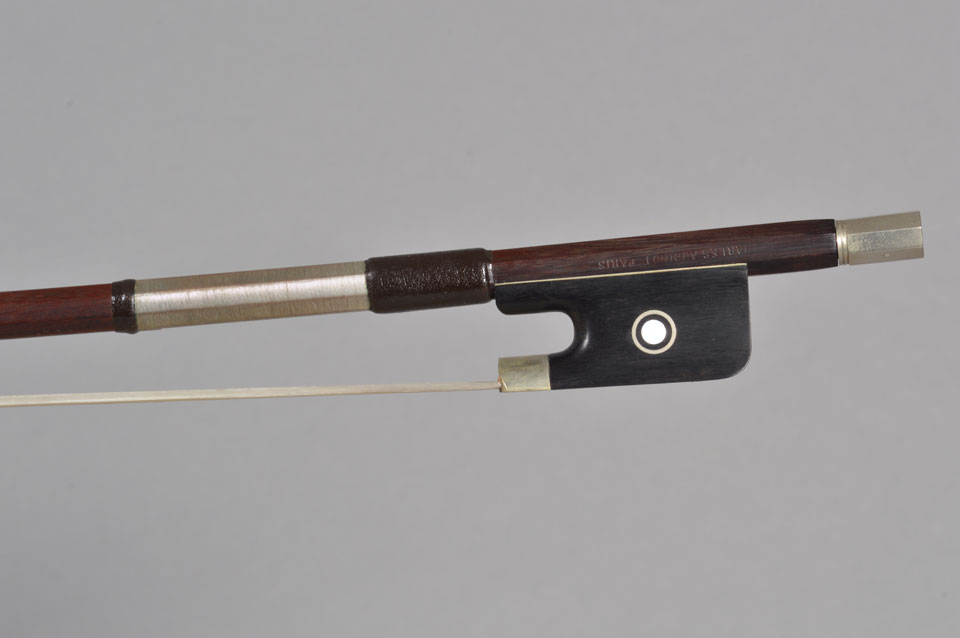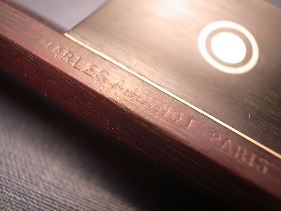 Vla.の弓は‘CHARLES AUDINOT PARIS’のスタンプが打たれていますが(AUDINOT家はフランスの大きな楽器製作家系)CHARLES AUDINOTがパリにある自身の店で販売するためにLotteに委託して製作させたものだと考えられます。非常に力強い男性的などっしりとした弓です。