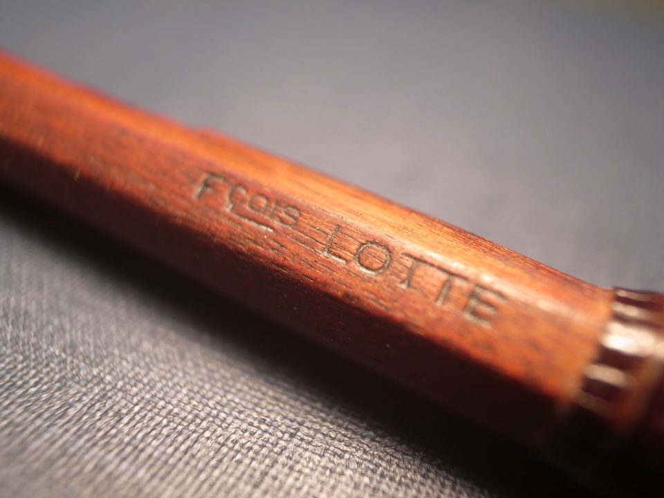 このVn.の弓に打たれている特徴的な焼き印は父親が使用していたものですが、付属しているGuillaume氏の鑑定書によると1950年頃のRoger Francois Lotteの作品だと考えられるそうです。共働していた頃の作品なので、父親の名義で販売されたものかもしれません。父親の型を踏襲した最も評価が高い時期の作品です。
