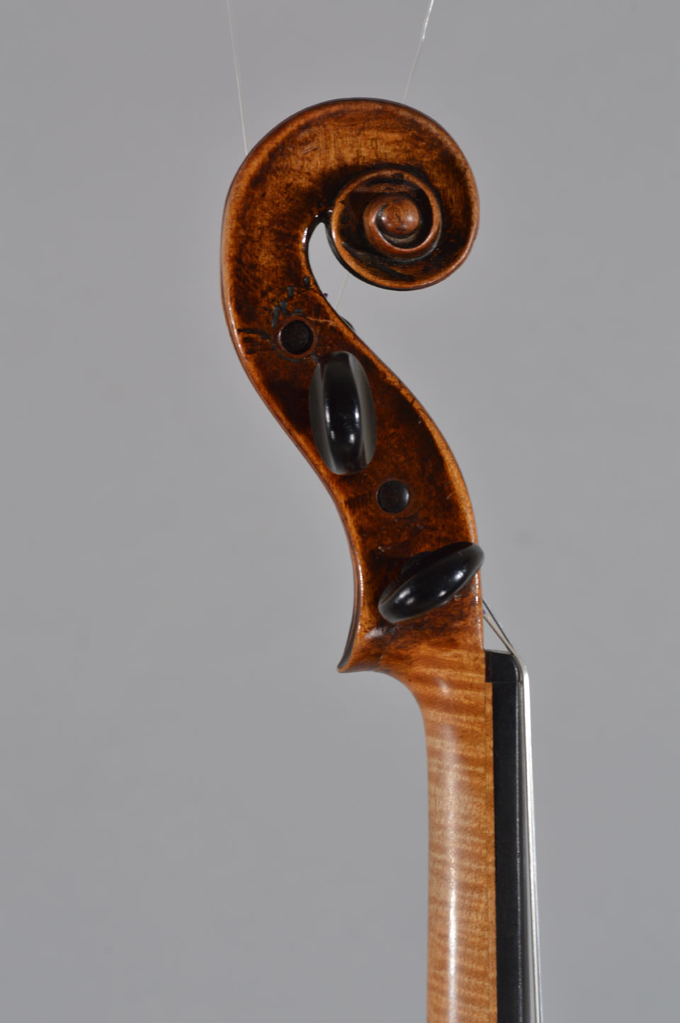 オールドジャーマンには Stainerを模したハイアーチのものが多く見られますが、この楽器は標準的なアーチで、表板は綺麗な台形をしています。表板には目の細かい松材が、裏板と横板には薄い虎杢の楓材が使用され、一目でKlotzと判る特徴的なスクロールを有しています。1770~1775年頃に製作されたものと思われ、独特の柔らかい音色を持っています。