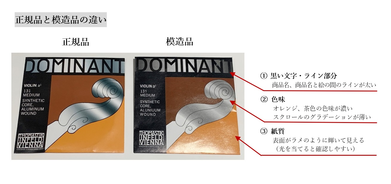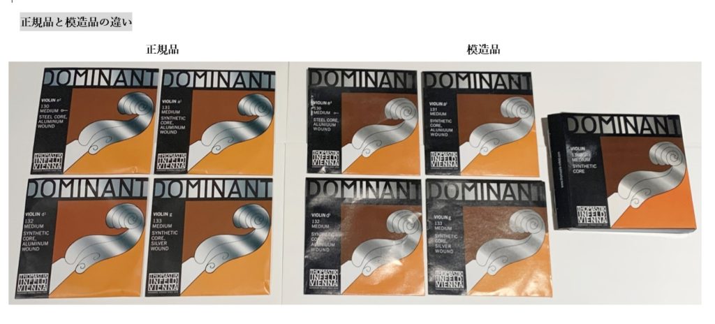 国内の店舗やECサイトにおきまして、ヴァイオリン弦DOMINANTの模造品の販売が確認されております。